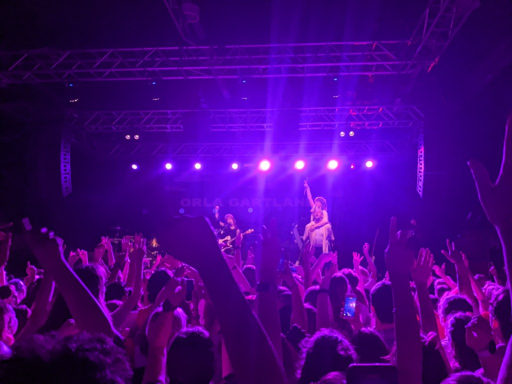 The obvious comparisons to dodie can only be taken so far. After a humdrum choice of opener Pretending, Things That I’ve Learned and oh GOD made a nice pairing with their unmistakably-Orla and risky odd time grooves that got the crowd shrugging along, even though dance moves are difficult to coordinate in 5/4. Sara Leigh Shaw was the right drummer for the job, clattering into the chorus on oh GOD with a laser focus. Tucked away slightly on the side of the stage, she looked uncannily similar to Gartland herself with her own mop of ginger hair that bobbed about in time to the stumbling groove behind that “I don’t wanna think about it” earworm. Gartland meanwhile looked ready to take on the world with her chequered green suit and matching neon green eyeshadow, commanding the crowd atop an inch or two of chunky Doc Martens. Rounding out the band was Pete Daynes. One of the standout performers of the dodie tour, his return was well received, with his enthusiastic jaunts wielding his P-bass around the stage earning him chants of “Pete! Pete! Pete!” on two separate occasions.