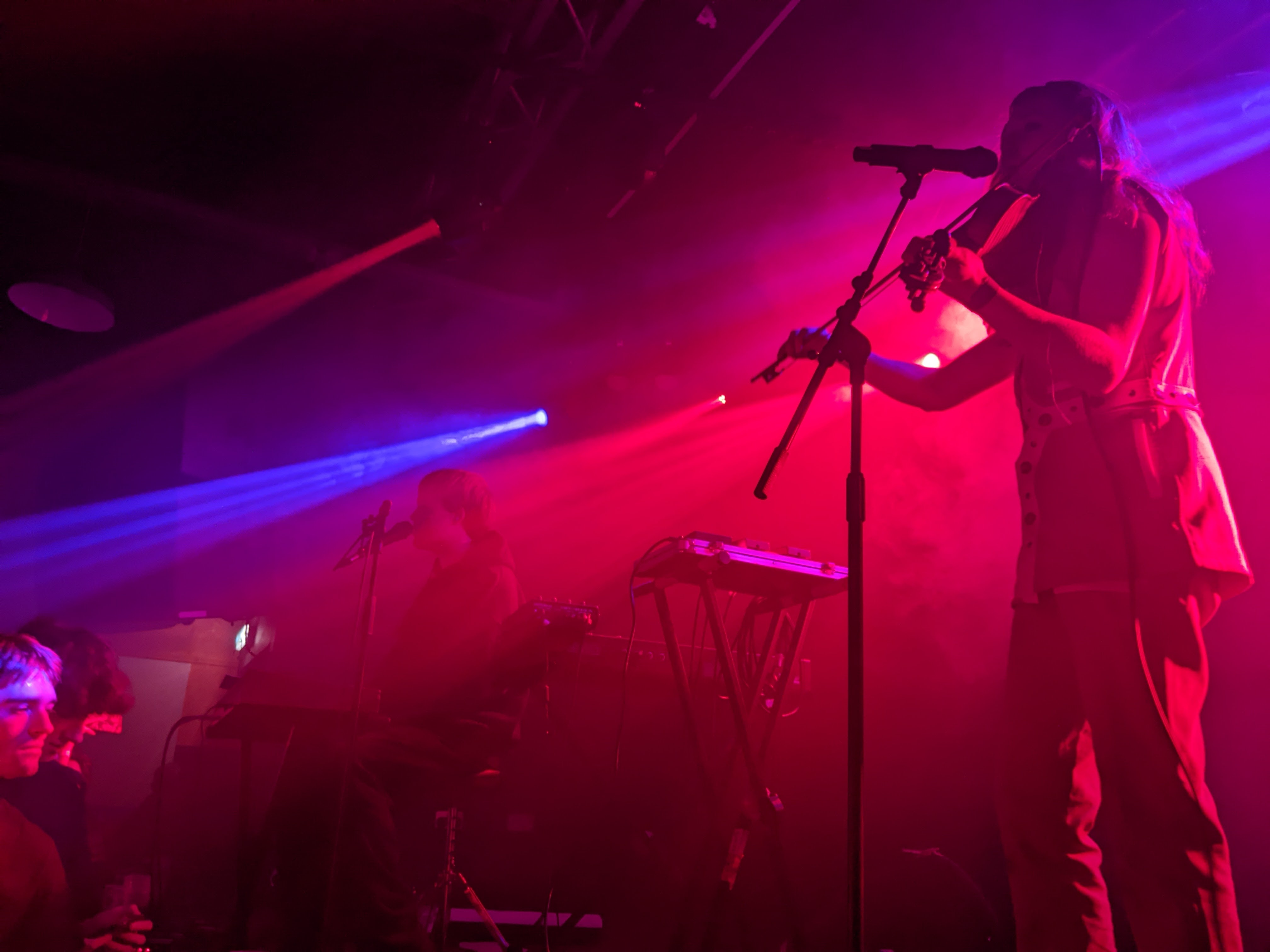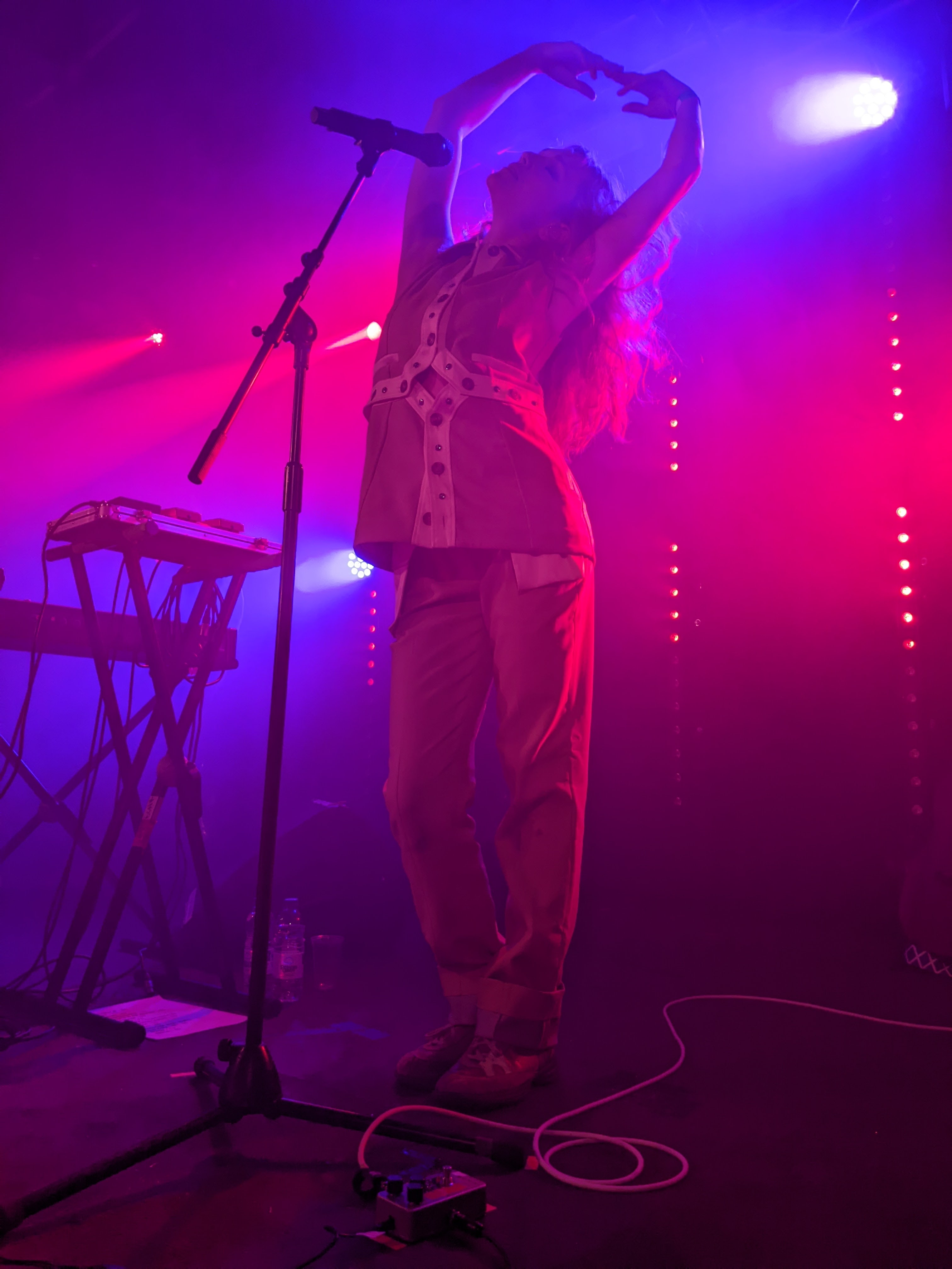 They may not sound quite like BC,NR, but the thirst for creative, eyebrow-raising songwriting is the same. On the duo’s slightly more straightforward tracks, this manifested itself in adventurous harmony, like on the shimmering Greatest Hits. Perhaps the closest thing Jockstrap have got to a pop singalong, the catchy “I believe in dreams, do you?” hook had the crowd on the pair’s side early on. There was of course no real drummer for the outstanding percussion break in the bridge, but Ellery was comfortable enough dancing impressively on stage, maintaining the excitement. All night, boredom was an impossibility. Even during these instrumental breaks, Ellery seemed laser focussed on the task at hand, be it decoratively splaying her hands in the air or squatting and clutching the mic stand like a predator in some of the more menacing passages of music. Further away from me, a shadowy Skye cowered over his synthesisers, the humble mastermind behind Jockstrap’s compelling soundworld. The occasions he peeked out his shell for a moment singing lead vocals on the apex of a few songs felt momentous.