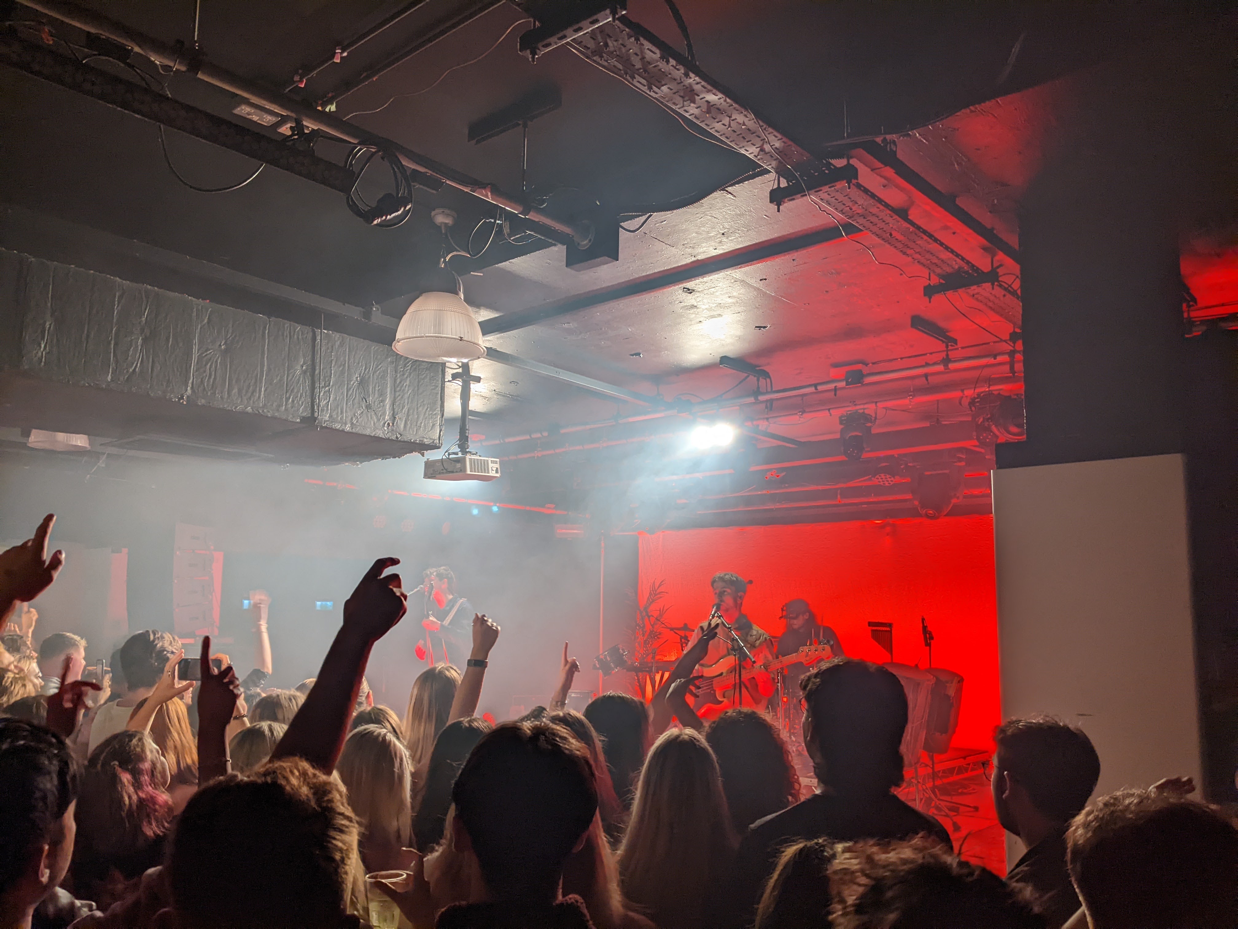 Of course, there was little queueing when we did locate the venue, which turned out to be a rather uninspiring black box two storeys underground, with a barrier two metres in front of the stage ensuring there would be none of the can-practically-touch-them intimacy I love with small venues. A bar was plonked at the back and a large empty space out of view of the stage occupied one half of the room. There wasn’t even a glitterball. In fairness, the audience steadily grew as the night wore on, although not before two support acts had been and gone. For a relatively small band, you begin to hope that this tour will be financially worthwhile for the musicians.