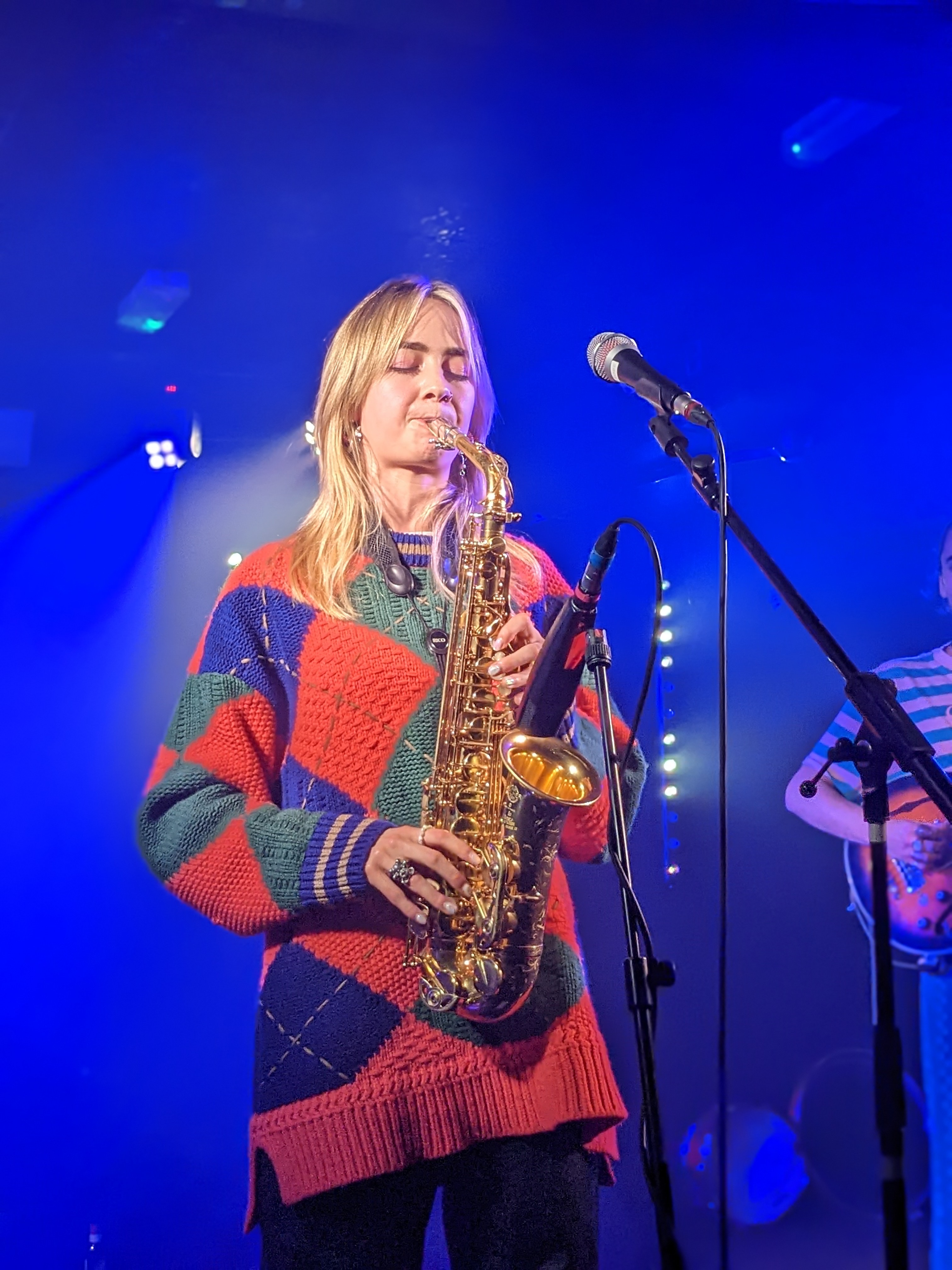 As a singer, it must be said, Wald-Harding tended to come across as somewhat tentative, never quite willing to go all in on a vocal even when Kinzan Mu’s outrageous bass fills urged her onwards. With a sax reed at her lips, however, Wald-Harding was a force of nature, her solos direct and startling, often whizzing up and down the instrument’s full range before letting out a fearlessly long high shrieks as the crescendos summited. Her habit of standing still and shutting her eyes in concentration for each show stopping solo occasionally made it seem as if the saxophone was playing her, and her ability to only so much as twitch as her unrestrained melodies soared skywards was almost as remarkable as the playing itself.