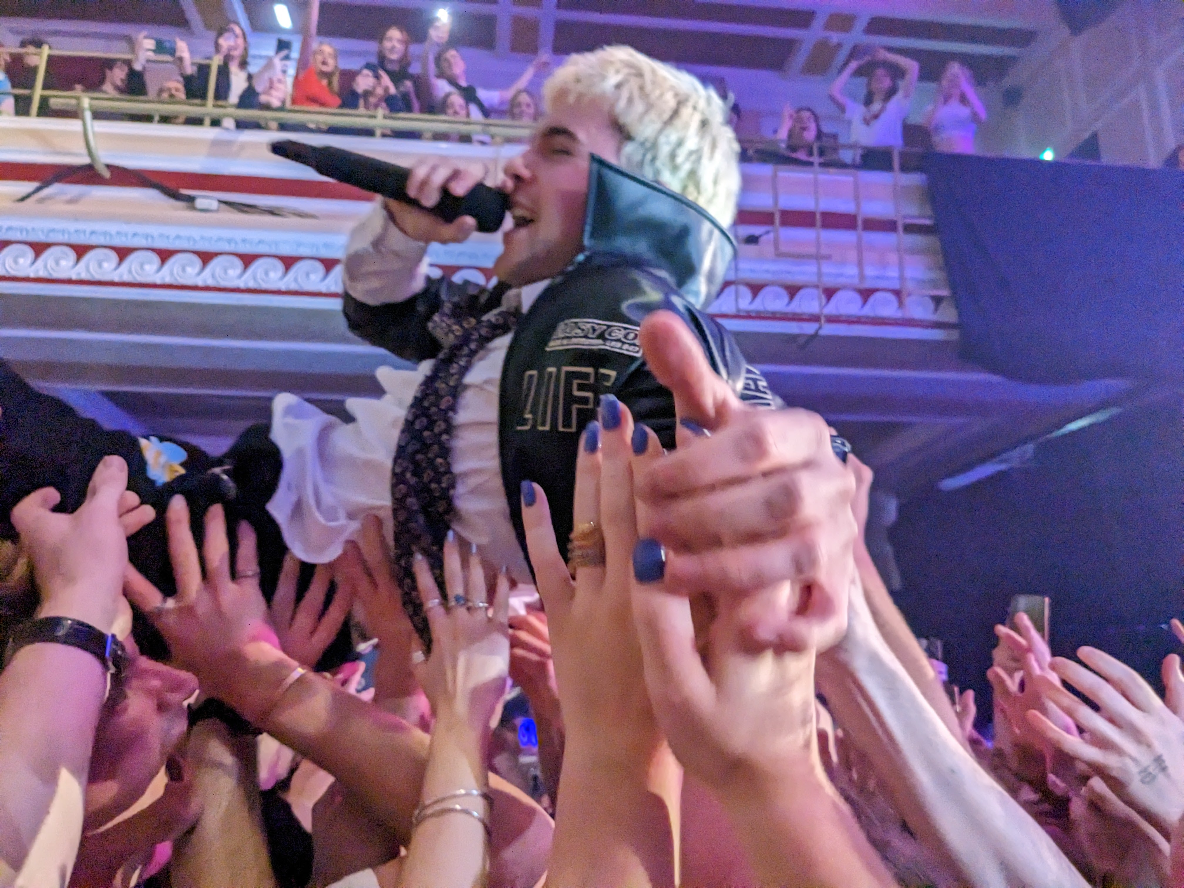 The enforced fun didn’t stop there. skeletons was the climax of the night, with scruffy looking drummer Oliver Cassidy orchestrating a mosh circle before impressively extricating himself from the sea of bodies in time for the final chorus. To be fair, if any easy life song warrants such chaos, it’s this one, and performed with a little extra abrasive attitude than the originals the dirty synths and shouty hook gave a satisfactory reason to work up a sweat and inadvertently become intimately aware of the hair hygiene routine of the person in front of you. At other times, the rock and roll antics were simply uncomfortable distractions from unfittingly amiable pop songs. Matravers spent much of breakout hit Nightmares surfing the crowd and, as fun as getting a hand on his shiny leather coat was, I was too busy avoiding getting kicked in the head by the popstar to appreciate the song’s rock solid chorus. Later, an outrageously jazzy trumpet solo was demoted to background music as guitarist Lewis Berry also had a crack at crowd surfing, apparently twisting his ankle as he fell off the stage but getting stuck in regardless. It was telling that I only realised how good the instrumental section sounded when watching back through my jittery footage of the whole hullabaloo in front of me.