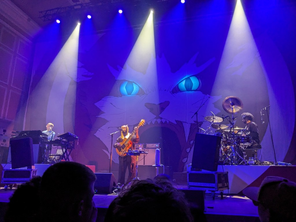 We arrived at Newcastle’s City Hall early enough to snag a prime spot in the crowd just three rows back from the front, close enough to marvel at the huge mural of a snarling cat hung up behind the stage. Unfortunately, gawping at a backdrop can only get you so far through the long wait that’s part of the deal with getting such a good spot in the crowd. Even the support act, New York DJ Kitty Ca$h (an inspired, apt choice from Thundercat just on name alone) was hardly stimulating, and her painfully American yelps of “Newcastle make some noise!!” between several middling pop remixes were mostly ignored by the crowd talking amongst themselves. Some lads next to us giving Alex copies of Thundercat-themed memes printed on A4 paper was about as exciting as the two hour wait got (Alex did hold up his meme during the concert and try to get Thundercat’s attention, but got little more than a glance from the star).